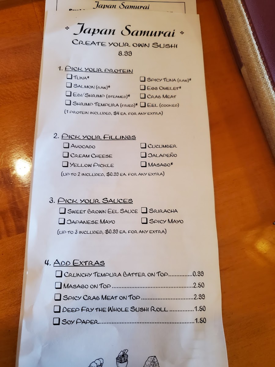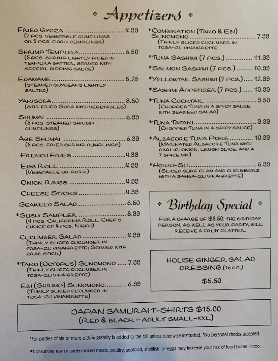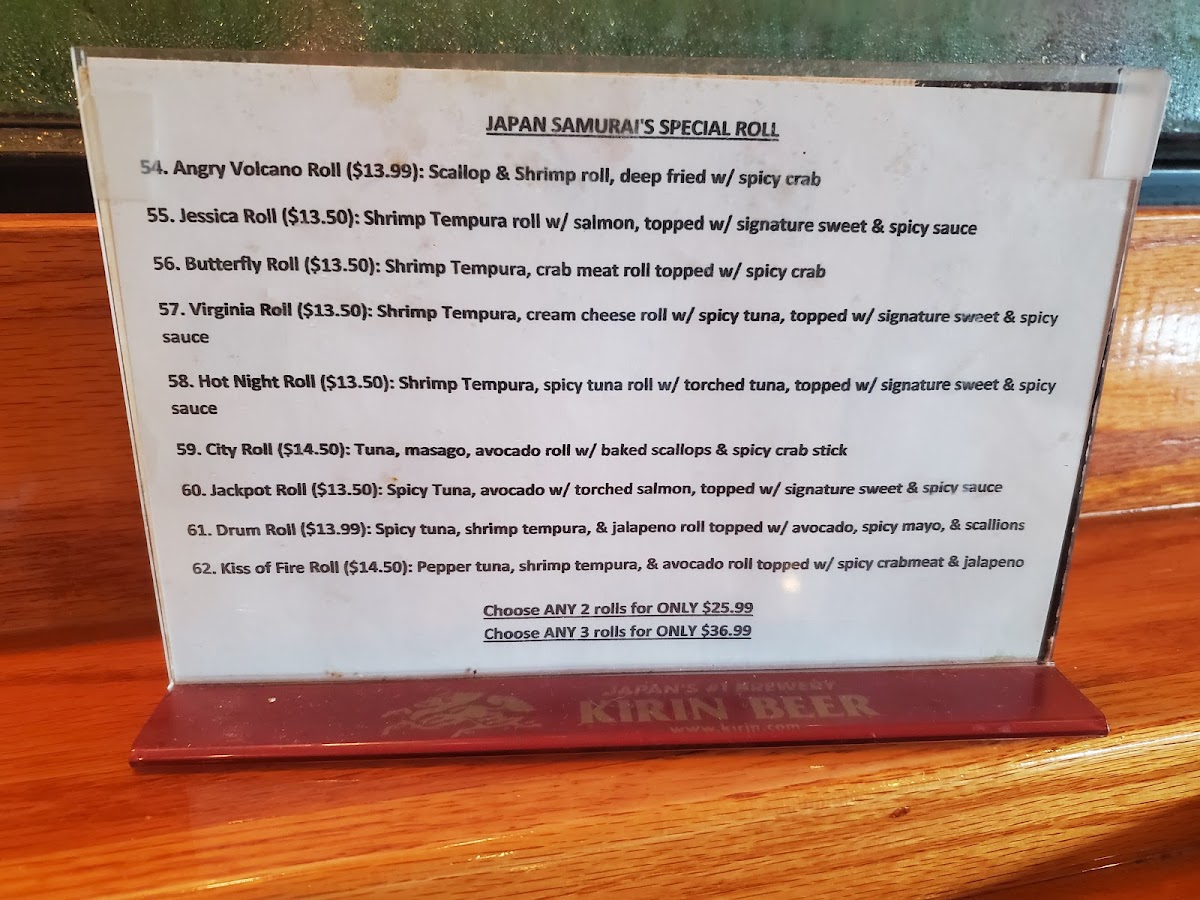 The Japan Samurai menu reflects the everyday pleasure of sharing flavorful, well-prepared food in a setting that feels both inviting and unhurried.